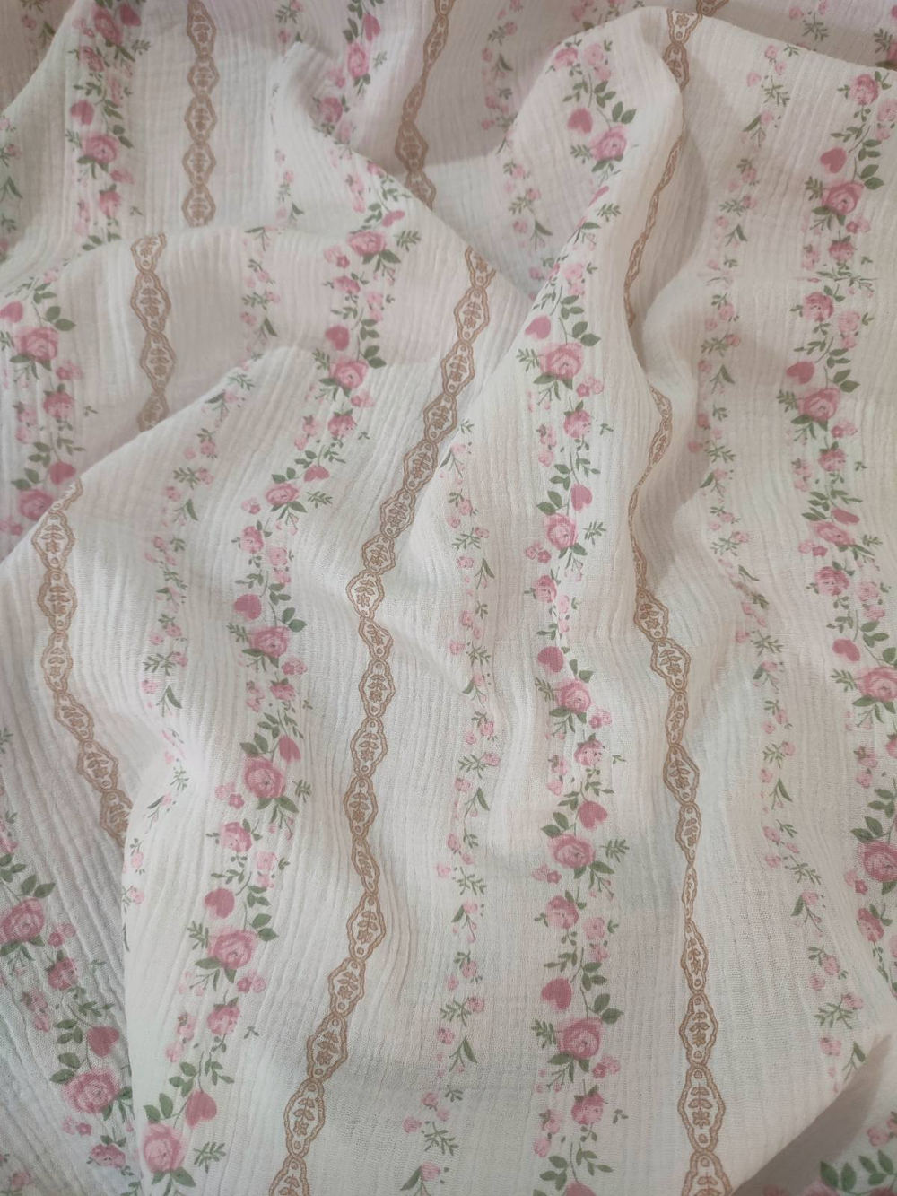 Муслин жатый принт (розово-бежевый цветочный орнамент )