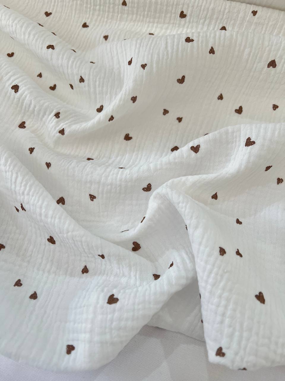 Муслин жатый принт (мелкие коричневые сердечки на молочном фоне)