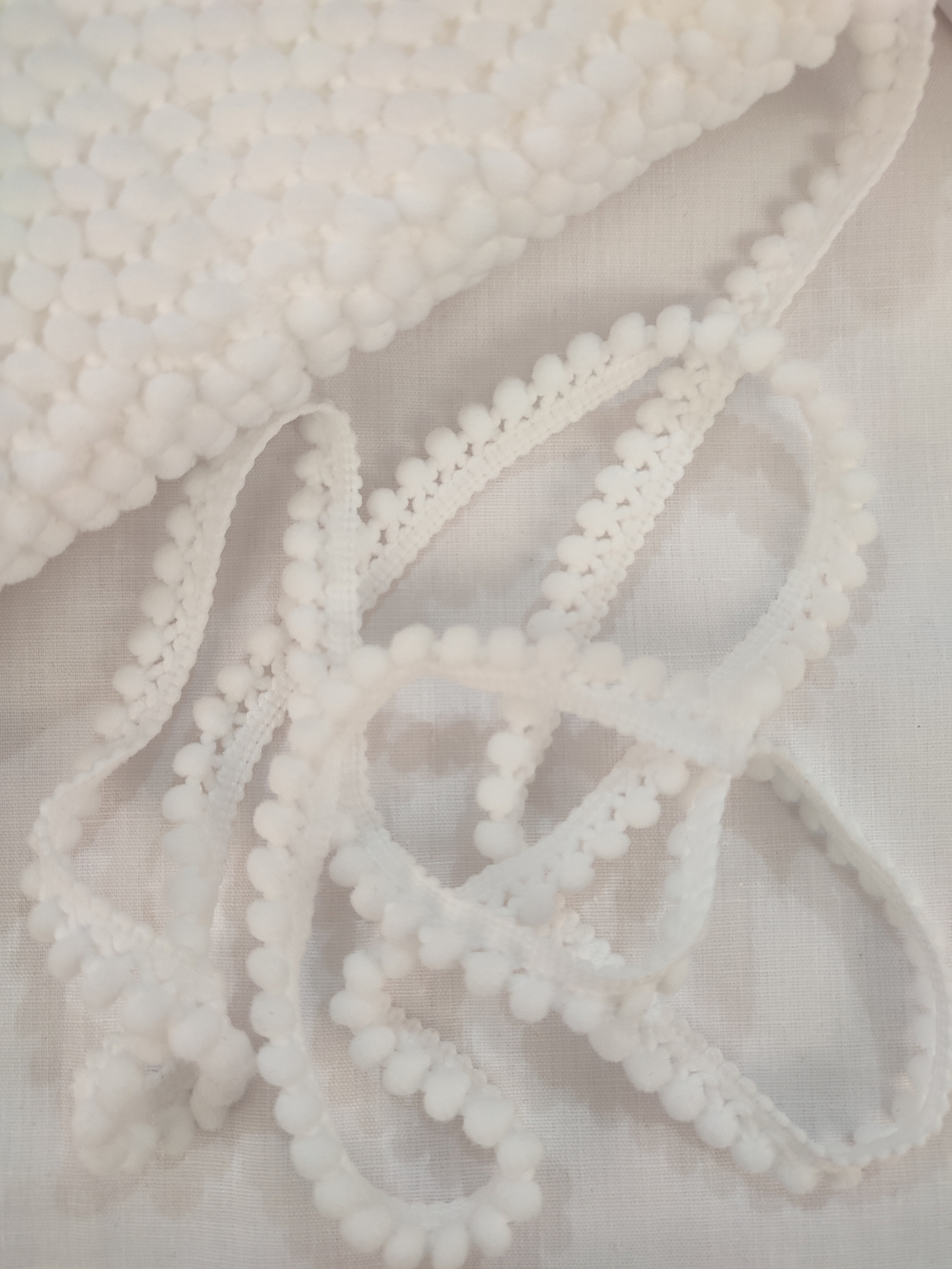 Тесьма с помпонами – это узкая полоса тканой ленты с вплетенными в нее текстильными шариками –помпонами.